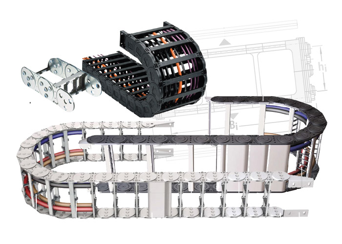- Zakryté kabelové a hadicové nosiče s plastovými nebo hliníkovými krycími systémy a kompletně uzavřenými nosiči trubek.
