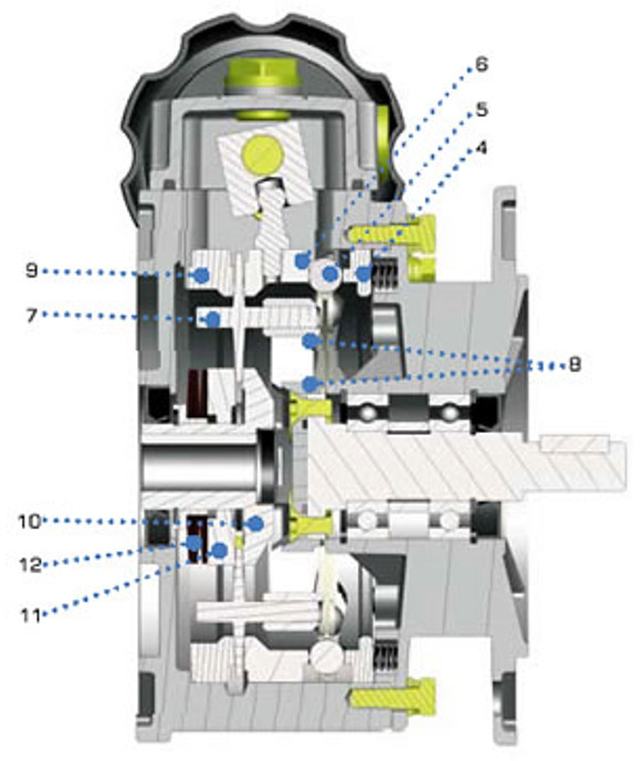 Otočením kontrolního spínače, mobilní kroužek (pozice 6) otáčí a pohání axiální posun, tento pohyb je způsoben kuličkovými ložisky (pozice 5) na opačné straně orbitálních kol (pozice 4 a 5 ). Tento prokluzový pohyb pohání kuželové strany satelitů, které se hýbou radiálně uvnitř (pozice 10 a 11) solárních kroužků, což překoná reakci pružiny (pozice 12), variaci kontaktní pozice.